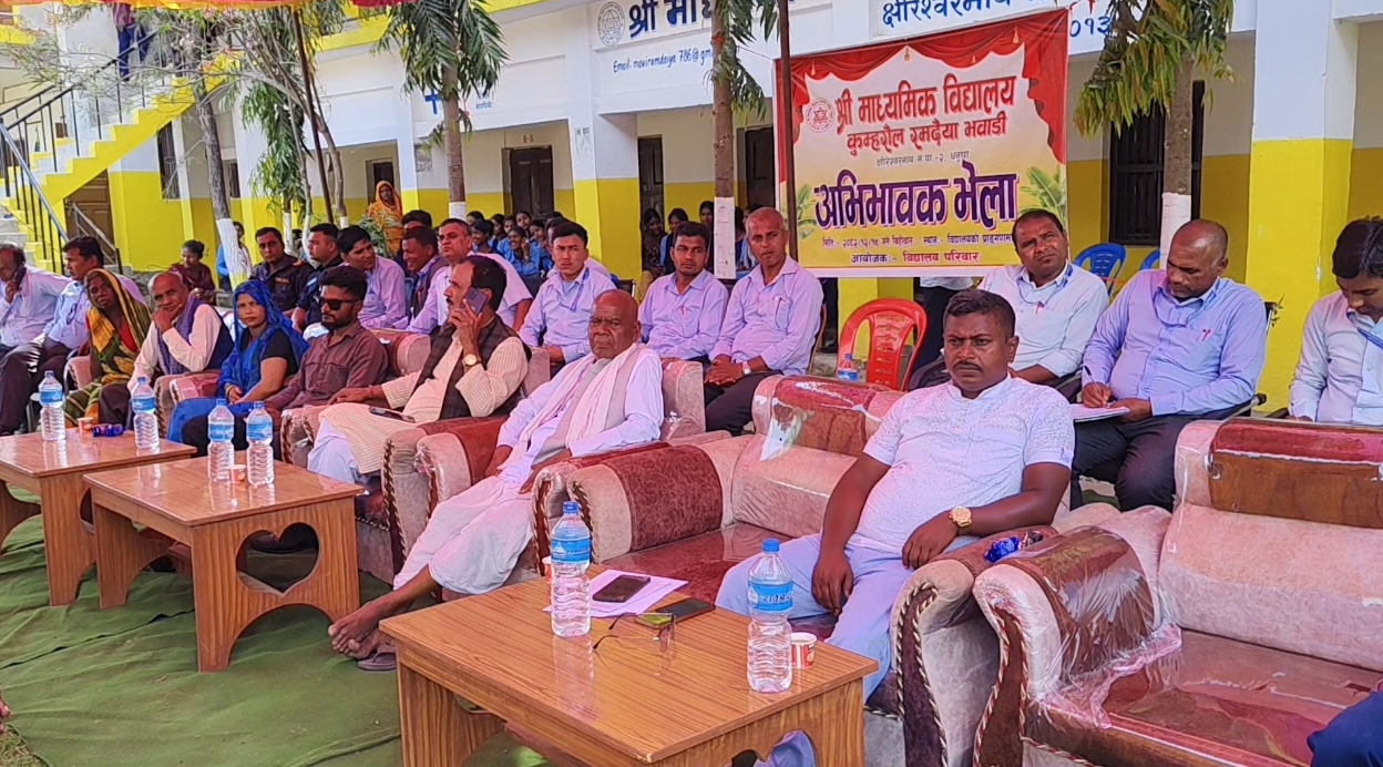 महेन्द्रनगर, धनुषा क्षिरेश्वरनाथ नगरपालिका–२ रमदैया भवाडी स्थित श्री माध्यमिक विद्यालय कुम्हरौल रमदैया भवाडीमा अभिभावक भेला सम्पन्न भएको छ । विद्यालयमा नर्सरीदेखि कक्षा ३ सम्म अंग्रेजी माध्यममा पठनपाठन सञ्चालन गर्ने विषयमा केन्द्रित रहेर आयोजना गरिएको उक्त भेलाले विद्यालयको शैक्षिक सुधारको दिशामा महत्वपूर्ण बहस अघि बढाएको छ । विद्यालय व्यवस्थापन समितिका अध्यक्ष जगदिस यादवको अध्यक्षता तथा क्षिरेश्वरनाथ नगरपालिकाका नगर प्रमुख सुखदेव यादवको प्रमुख आतिथ्यतामा सम्पन्न कार्यक्रममा स्थानीय जनप्रतिनिधि, विभिन्न संघ–संस्थाका प्रतिनिधि, राजनीतिक दलका स्थानीय नेता तथा अभिभावकहरूको सहभागिता रहेको थियो । कार्यक्रममा प्रमुख अतिथि सुखदेव यादवले सामुदायिक विद्यालयको गुणस्तर सुधार गर्न समयानुकूल परिवर्तन आवश्यक रहेको उल्लेख गर्दै अंग्रेजी माध्यमको सुरुवातले विद्यार्थीलाई प्रतिस्पर्धात्मक र सक्षम बनाउने विश्वास व्यक्त गरे । उनले नगरपालिकाले शिक्षा क्षेत्रमा सुधार ल्याउन आवश्यक नीतिगत तथा व्यावहारिक सहयोग गर्ने प्रतिबद्धता समेत जनाए । “सामुदायिक विद्यालयप्रति अभिभावकको विश्वास बढाउन गुणस्तरीय शिक्षा अनिवार्य छ, त्यसका लागि यस्ता नयाँ पहल अत्यन्त आवश्यक छन्,” उनले भने ।